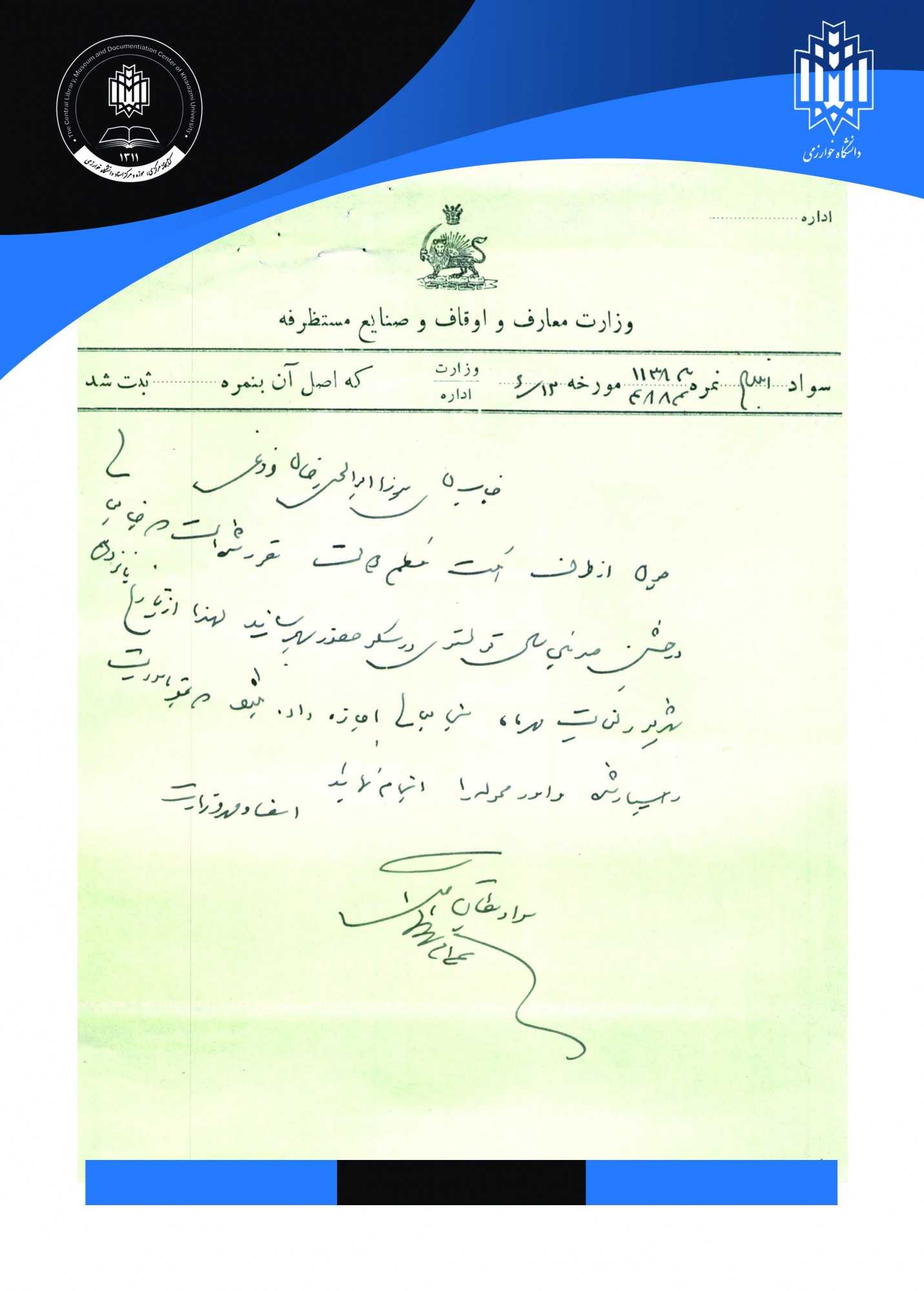 کلیدواژه ها: دارالمعلمین | ابوالحسن فروغی | موزه و مرکز اسناد | دانشگاه خوارزمی | کتابخانه مرکزی |